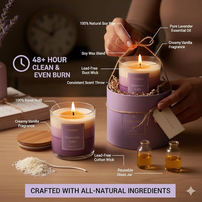 Ready to transform your home atmosphere? Bring home the Fiamora | Lavender Latte Scented Jar Candle today and turn every moment into a calming ritual.